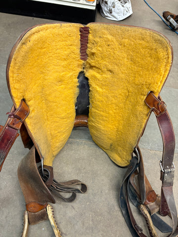 Barrel Saddle with a Square Skirt. Basket and Oak leaf tooling. Rawhide and silver laced cantle, Rawhide horn, Padded seat, Full Quarter Horse Bars,