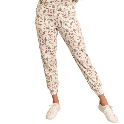 Rock & Roll Denim Women's Western Print Joggers. Made with a 65% polyester and 35% cotton blend, these joggers feature a natural color and a Western print all over. The double hand pockets and adjustable drawstring waistband provide both functionality and fashion. The rib knit waistband and ankle cuffs add a touch of uniqueness to these versatile joggers. Upgrade your wardrobe with these must-have joggers! Matching Hoody available.