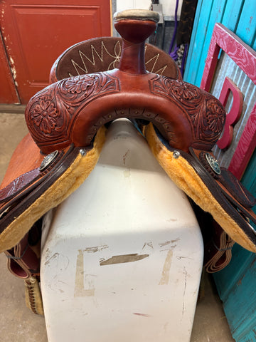14" All around saddle by Scott Thomas saddles. This saddle is perfect for roping or barrel racing in the arena, or heading down the trail.