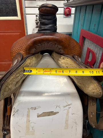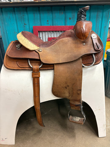Used Courts roping saddle in good used condition. Rougout fenders and jockeys. Stirrup leathers have been trimmed, but are still long enough for most riders.