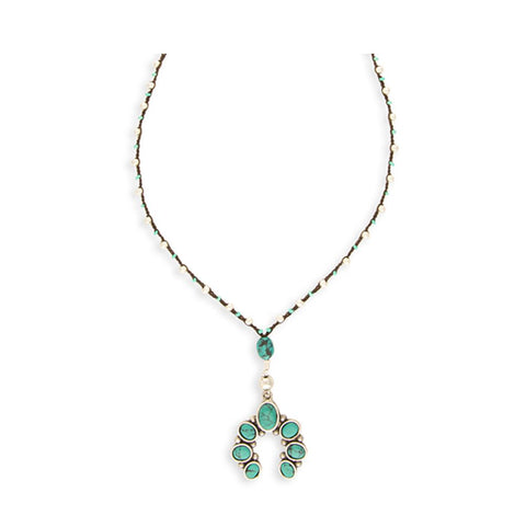 This beautiful necklace features a squash blossom pendant. It hearkens to the spirit of the Southwest as a wonderful addition to your jewelry ensemble.